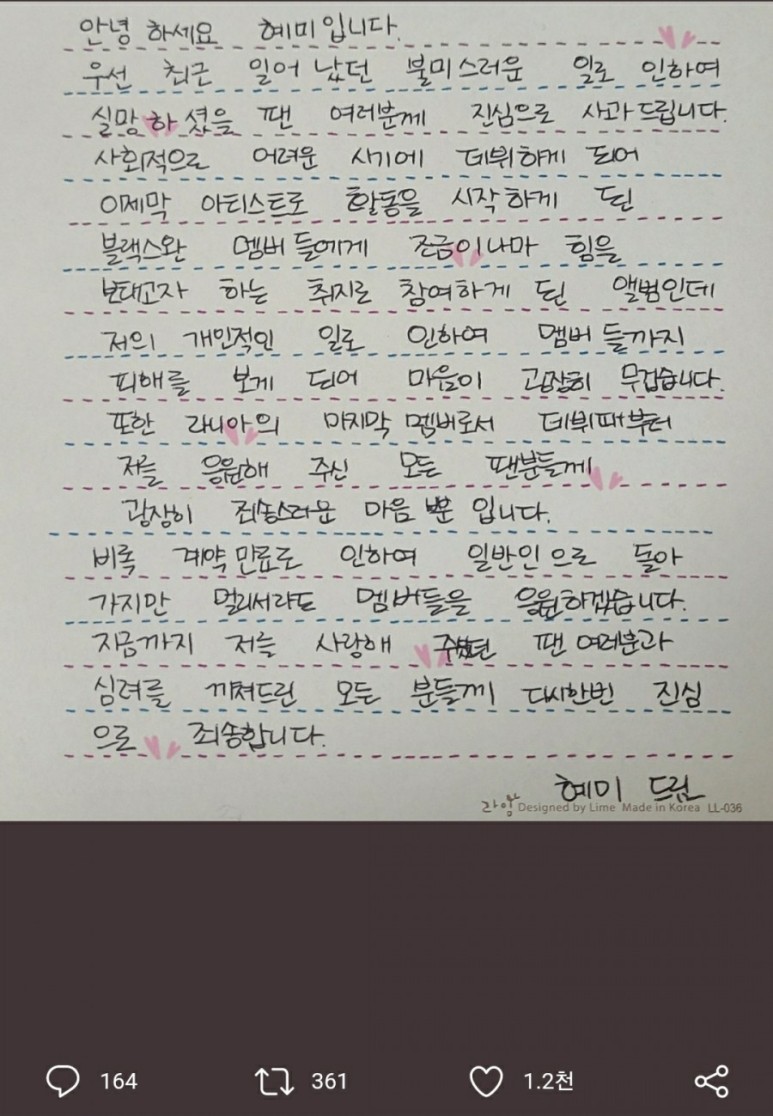 블랙스완 혜미가 사기혐의 피소로 팀을 떠난다 친필 사과문 트위터 혜미 드림
