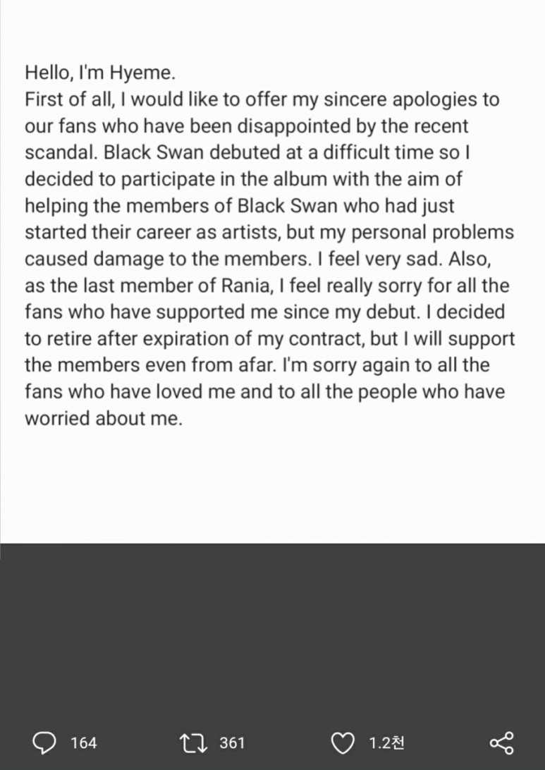 안녕하세요. 혜미입니다.우선 최근 일어났던 불미스러운 일로 인하여 실망하셨을 팬 여러분께 진심으로 사과드립니다.사회적으로 어려운 시기에 데뷔하게 되어 이제 막 아티스트로 활동을 시작하게 된 블랙스완 멤버들에게 조금이나마 힘을 보태고자 하는 취지로 참여하게 된 앨범인데 저의 개인적인 일로 인하여 멤버들까지 피해를 보게 되어 마음이 굉장히 무겁습니다.또한 라니아의 마지막 멤버로서 데뷔 때부터 저를 응원해 주신 모든 팬분들께 굉장히 죄송스러운 마음 뿐입니다.비록 계약만료로 인하여 일반인으로 돌아가지만 멀리서라도 멤버들을 응원하겠습니다.지금까지 저를 사랑해 주셨던 팬 여러분과 심려를 끼쳐드린 모든 분들께 다시 한번 진심으로 죄송합니다.혜미 드림